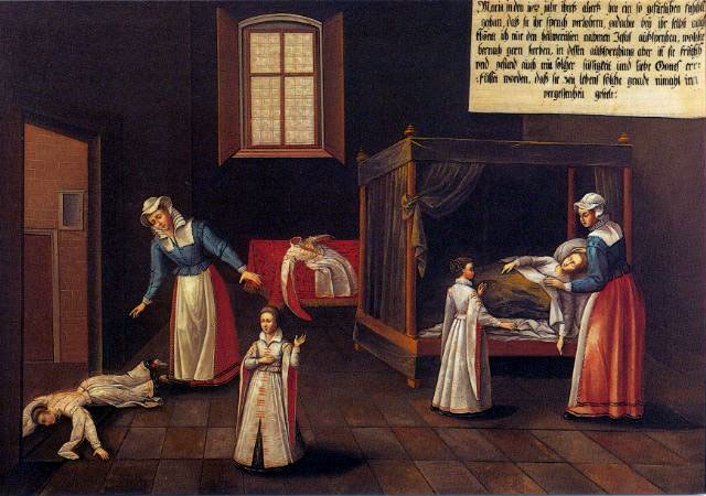 There are fifty paintings, each 142 x 105 cm, known as the ‘Painted Life of Mary Ward’ that show her spiritual journey. They are displayed in the ‘Mary Ward Hall’ in Augsburg in Germany. Very little information has come down to us as to the origins of the paintings. It is most probable that they were painted by various artists somewhere between Flanders and the Tyrol in the second half of the seventeenth century. There is written evidence that places them in Munich between 1680 and 1717, but how they came to Augsburg is unknown.